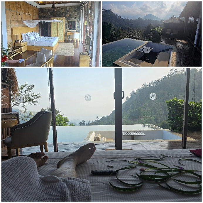 The hotel was stunning and the staff were incredible. It was situated below little Adams peak in-between tea fields. It was so so nice and made even better knowing that we had paid so much less than everyone else staying there! We hung out in the room and enjoyed the privacy of the heated plunge pool.